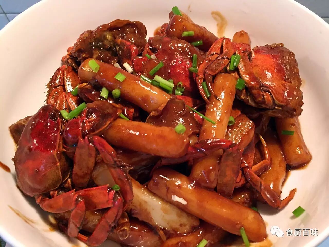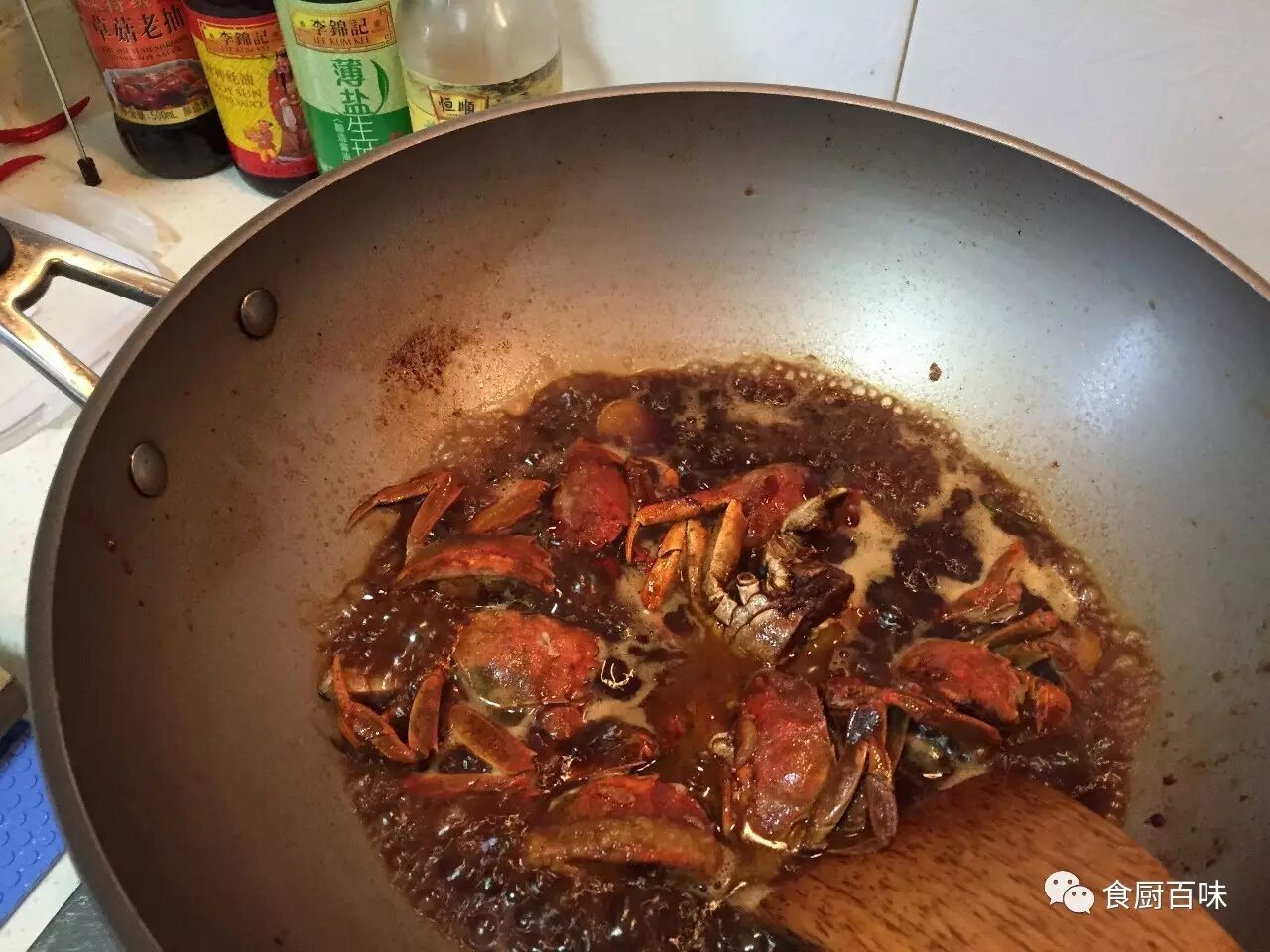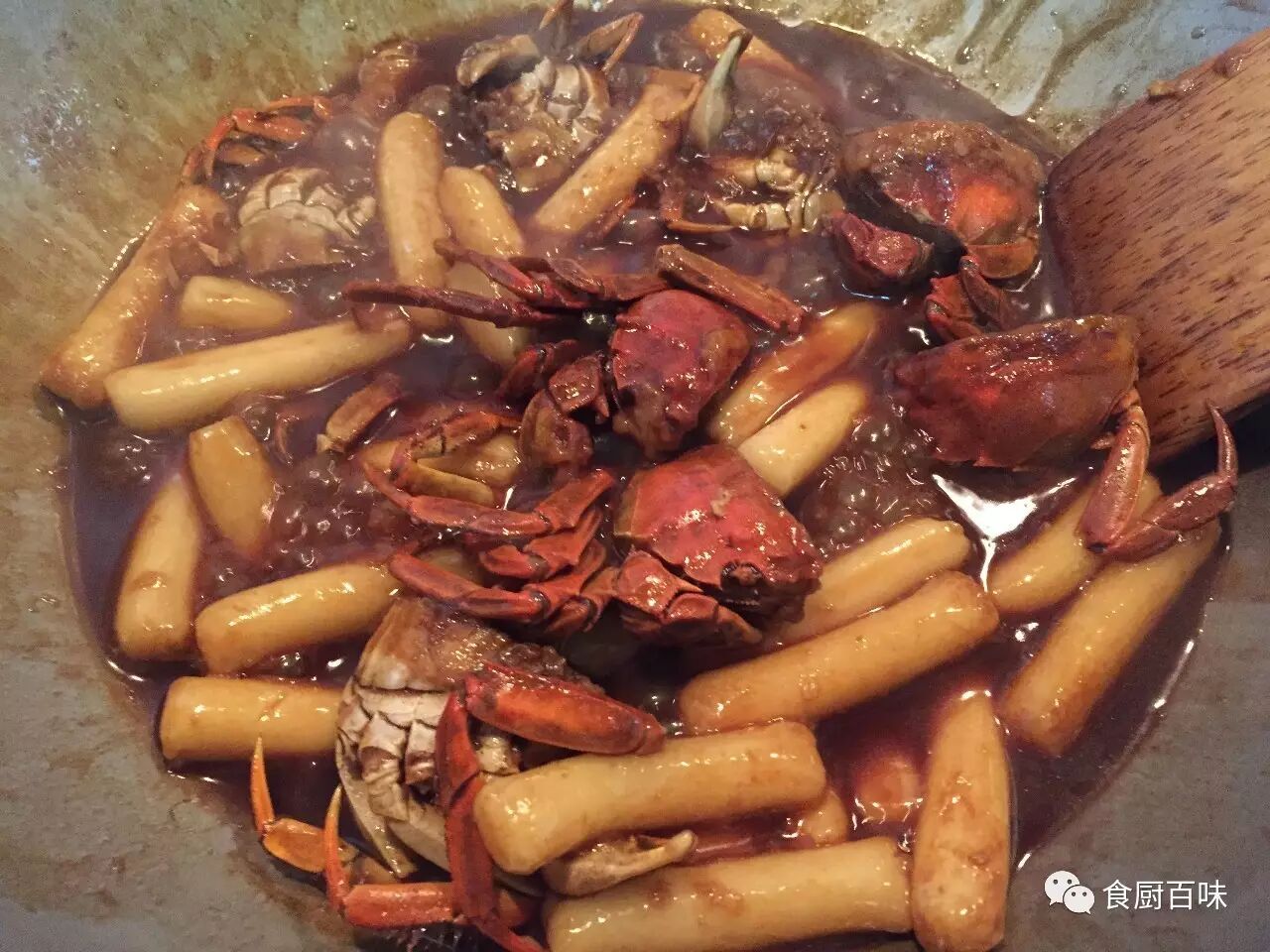 而后加生姜片、葱白一同翻炒至蟹壳变红,淋些料酒去腥提香。