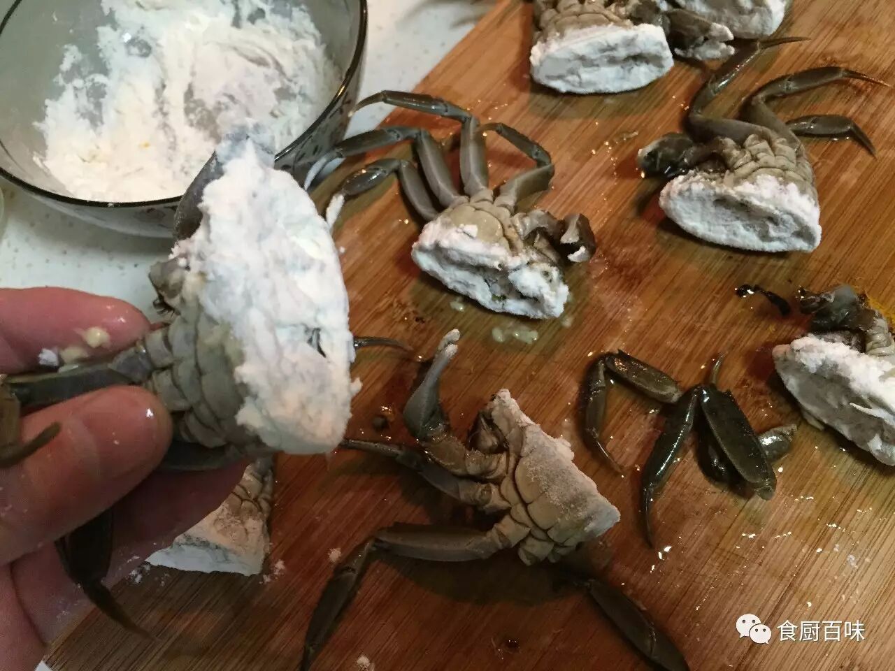为防止烹制过程中蟹黄流失,横截面沾上干面粉,起到固定作用。