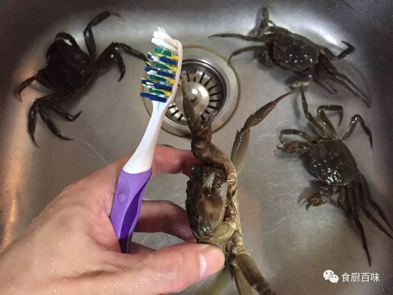 逐个清洁毛蟹的外壳,去除水草和藻类等附着生物,冲洗干净。