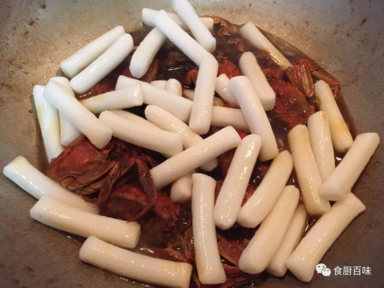 加入年糕需不时翻动,使年糕入味,同时避免粘锅。