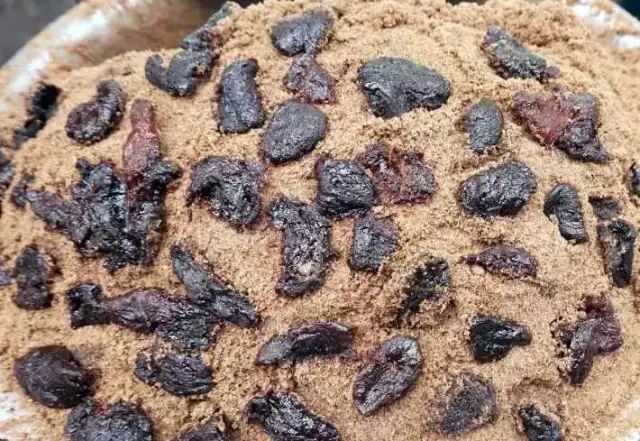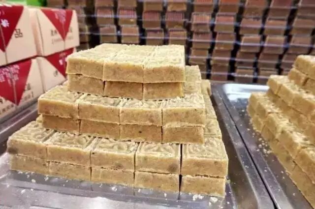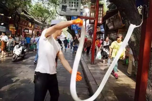 一个回族男子在店铺前现场制作酥糖,拉出了很长的拉丝。