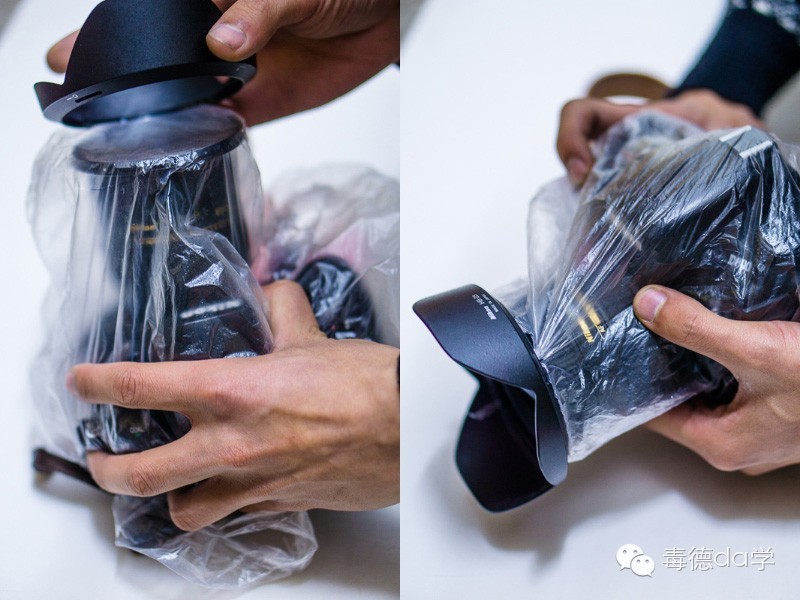 最简单的方法就是自己DIY一个防水袋:找到一个塑料袋包住整台相机,然后装上遮光罩剪出一个小口给镜头拍摄。