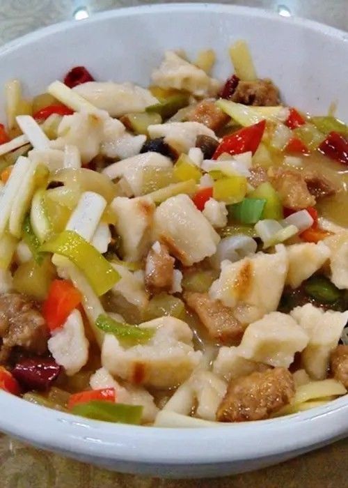 环境比一般的小店略好些,三鲜煮馍汤鲜馍筋,配有五花肉、响皮、丸子等,看着很丰富。推荐他家的莲菜炒肉煮馍,很脆生很讲究,民间传说的“三鲜戴帽”说的就是这啦