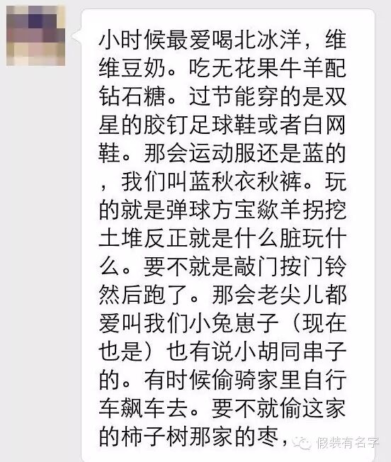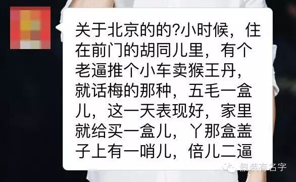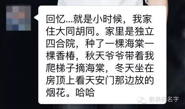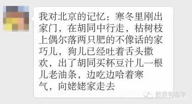 精分少年欢乐多:回忆嘛。。嗯。没住过胡同,所以没有体会过北京的胡同文化,可是那个时候住在静安庄(老楼房),感觉到了跟胡同一样的氛围,怎么说呢,我是在整个楼的邻居眼皮子底下长大的(从一门到九门都知道我),小时候跟着爷爷奶奶出趟门,邻居看到了都会问候(当然也会顺便带上我),好多邻居做了什么好吃的都会顺带给我一份,家里没人邻居也会来照顾我,谁家打架了,邻居们也会各种劝架,感觉很温馨吧,可能我贪吃的性格就是那个时候培养的,还有玩伴,要出去玩都在楼底下喊我出来,当然已经最少十年过去了,好多以前的邻居啊,爷爷奶奶有的都去世了或者搬走了,好多以前的玩伴也搬走了,这是比较温馨的回忆,还有就是我的奶奶,这个可以回忆一辈子,必须要说,发生在北京我就当跟北京有关系了,这么说吧,我真的是“宠儿”,小时候最爱喝乐百氏健康快车,(有多爱喝呢,基本上一天可以干掉半箱子,小时候喝出了7颗虫子牙,门牙都喝黑了,哈哈哈,就是爱喝)记得最清楚的就是有一天晚上,已经11点多了,小卖部关门了,然而我的乐百氏喝完了,那个时候各种闹,我爸拿来一个乐百氏的瓶子里面兑上牛奶给我,我喝了一口就给扔了(现在想起来可逗了),然后大声喊,结果我奶奶穿好衣服,出门去给我买,11点多了,求小卖部开门,被埋怨着买了一排给我,就这样我喝完了才入睡,那个时候不懂感恩吧,还跟我家里人发一些脾气,最后,北京生我养我,生活在北京,感恩父母,感恩以前对我好的,跟我玩的人!