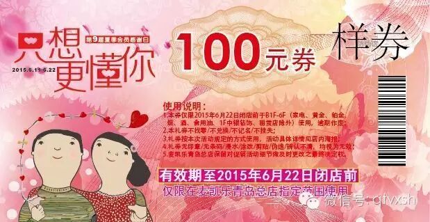 观看本条微信并截图回传就有机会获得:价值100元的麦凯乐〈青岛总店)提供的全店通用购物卷。