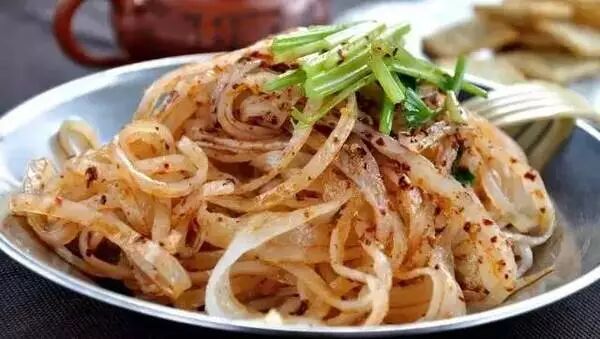 西安凉皮种类繁多,由面粉或大米为原材料制成,所以分为米皮和面皮两大类。米皮白且透亮,面皮颜色比米皮稍黄,吃面皮时会拌入面筋。是夏天解暑的不二凉品。