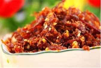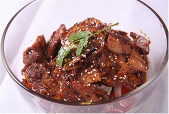 12、张飞牛肉,阆中市区名叫保宁镇,回汉杂居。老回民在逢年过节时会制作腌牛肉,人们在牛肉表面涂抹锅烟灰防腐。该牛肉最大的特点是表面呈墨黑色,切开后内部肉质却是棕红色,很是好看,后人因其面黑心红形似张飞而将其名为张飞牛肉,因此名字取得恰当,于是迅速被人们熟悉。