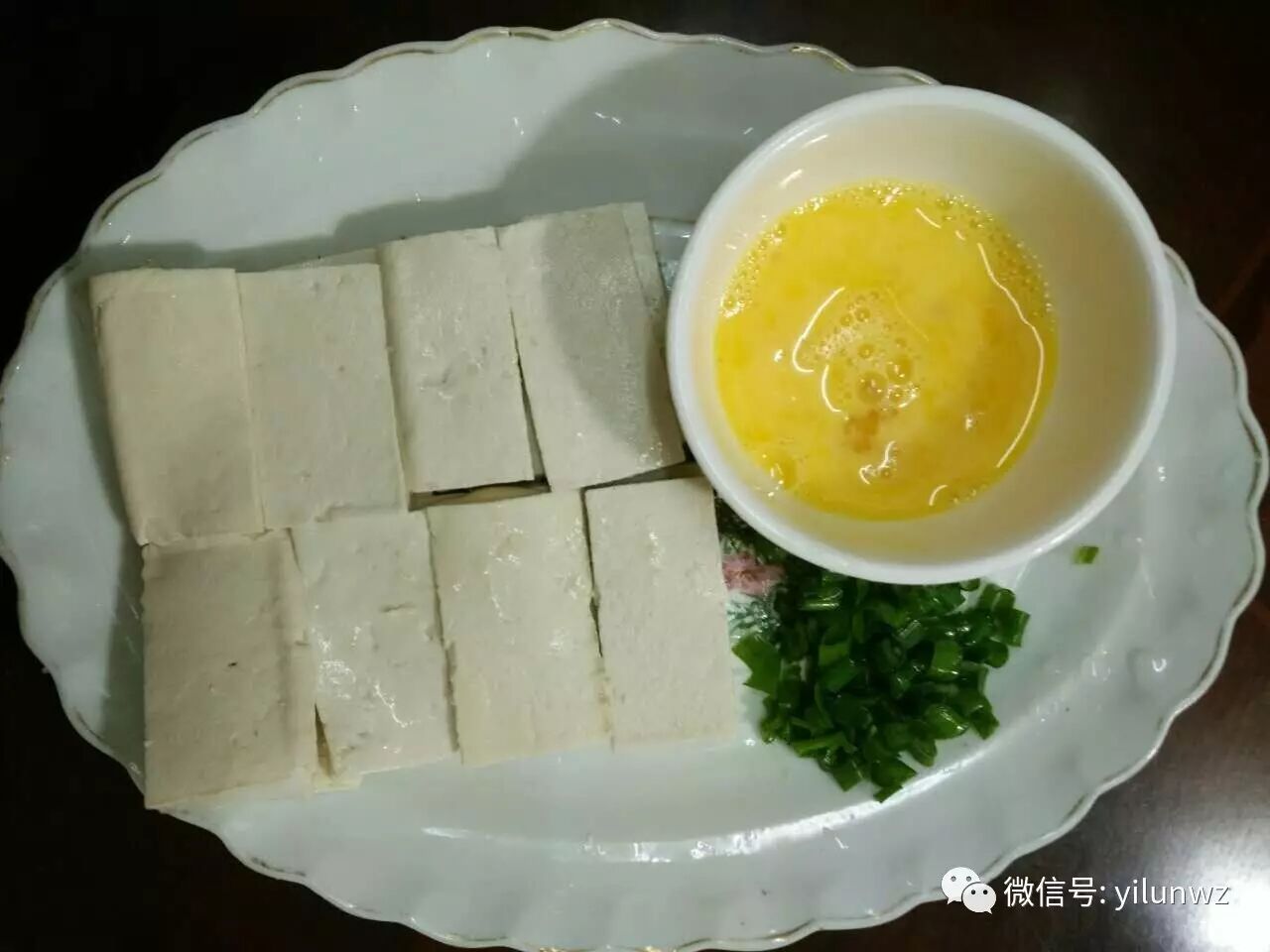 3.热锅放入油,将豆腐片沾上蛋液放入锅内煎成金黄色后捞在盘子上。