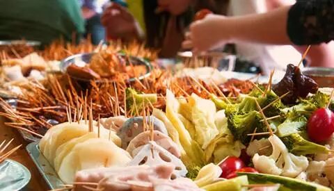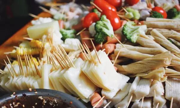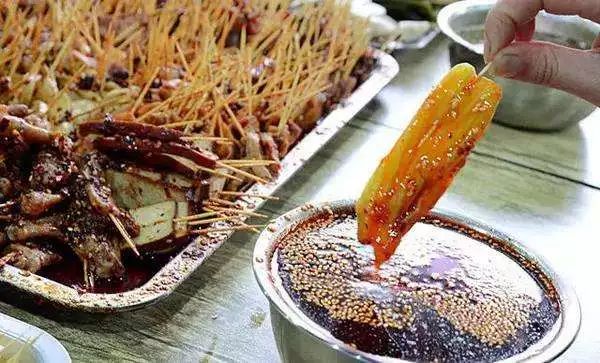 各种食材,用牙签串成串串,蘸料居然是共用的,吃的时候、先沾蘸料再吃。每个牙签5毛钱,最后就是数牙签算价格。