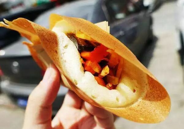 蛋烘糕有很多种吃法,甜的可以加奶油、果酱,辣的可以加辣椒酱、大头菜,咸的可以加盐菜。懂得起的小伙伴,一般都会来个混搭。比如说我就喜欢奶油加蓝莓~蛋烘糕价格2.5元/个。
