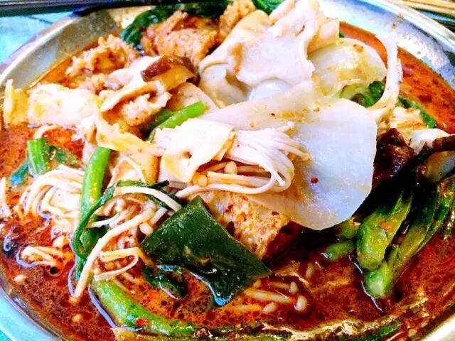 肉和普通的川式烤肉不一样,朋友说西安烤肉就是这个味道。发现烤肉的时候是刷的辣酱,第一次见~肉不腻,味道不错,肉串挺大的,只是上菜慢,需要耐心等~涮菜也很不错,里面有很多芝麻酱,吃起来很香。