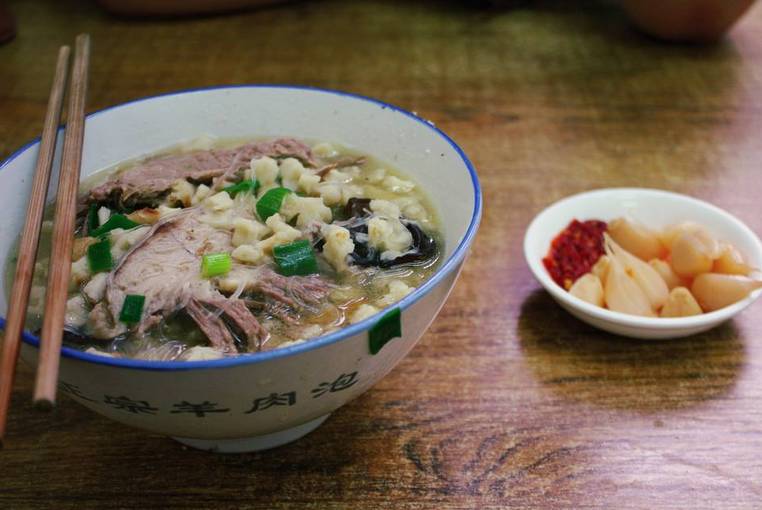 牛羊肉泡馍:牛羊肉泡馍是西安著名的小吃,用优质的牛羊肉加佐料入锅煮烂,汤汁备用。把烙好的坨坨馍,掰成碎块,加辅料煮制而成。最好牛羊肉泡馍是,肉烂汤浓,香醇味美,粘绵韧滑。吃完再来一碗高汤,更觉得余香满口,吃的时候可以配一碟特制的糖蒜,口感更好。