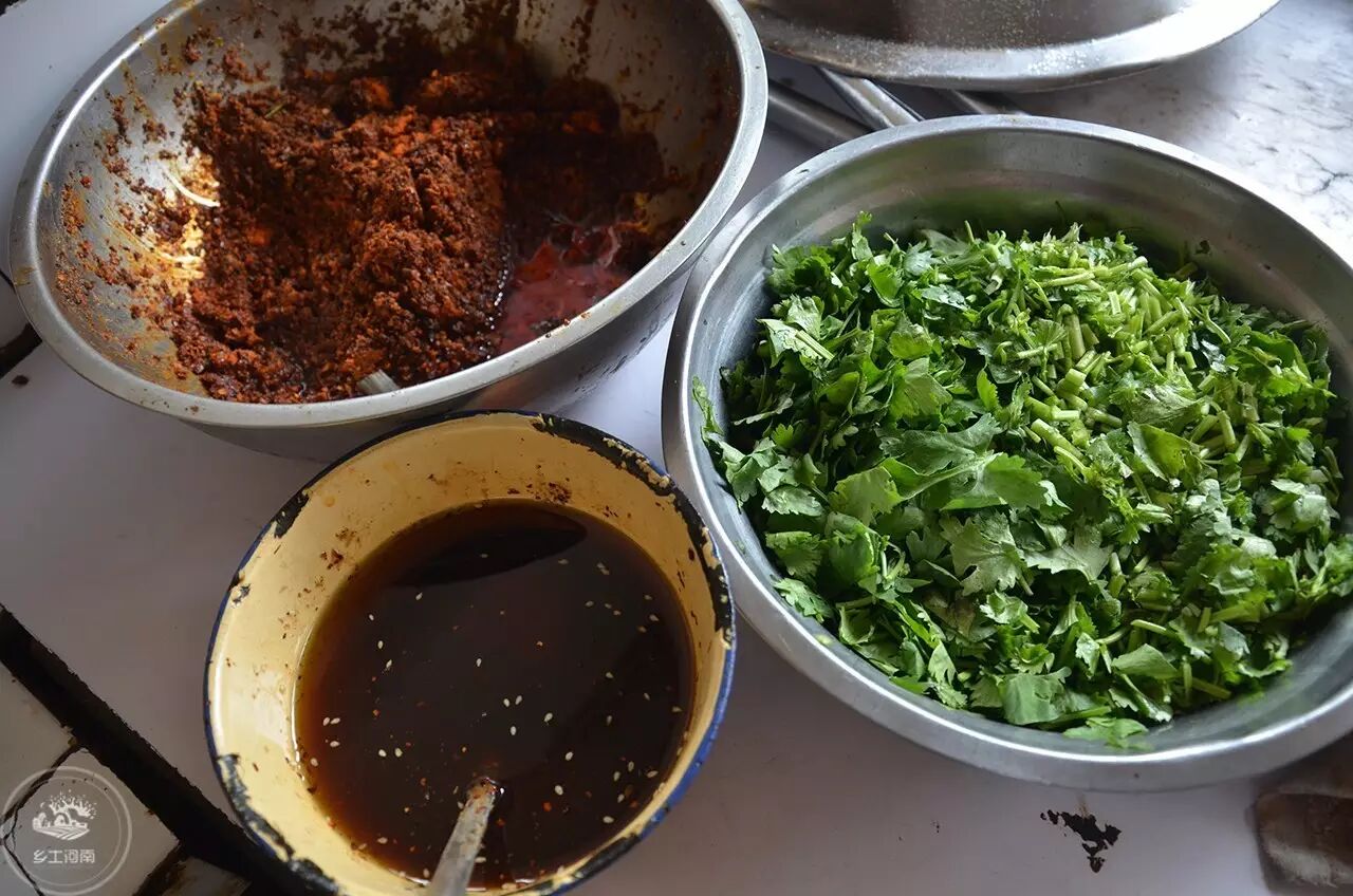 烩馍的调味分两次进行,在烩的过程中依次添加各种调味料,装碗后还要进行二次调味,羊油辣椒、小磨香油和香菜必不可少。