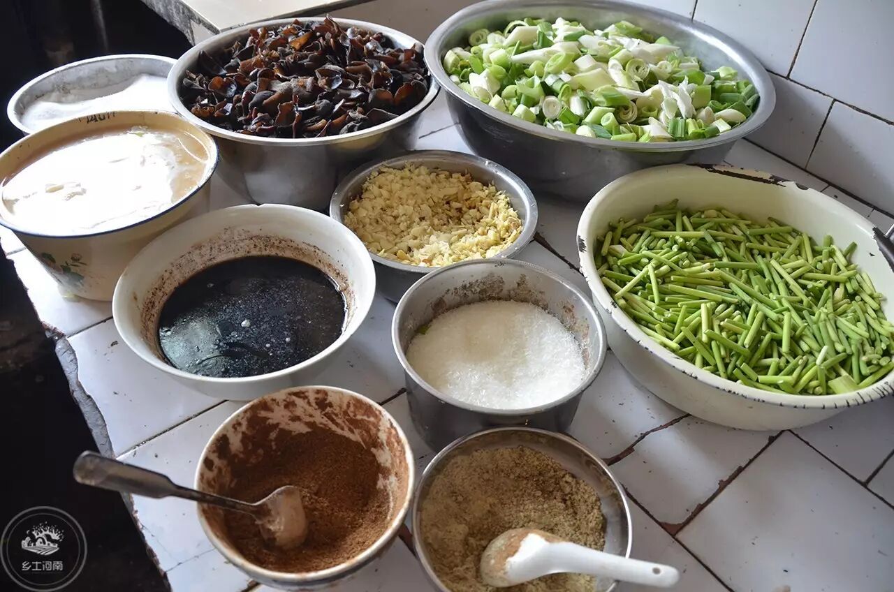 在曹师傅的锅灶上,摆满了做烩馍用的调料和菜料,有木耳、大葱、蒜苔、蒜末,调料也很常见,就是味精、五香粉之类的。