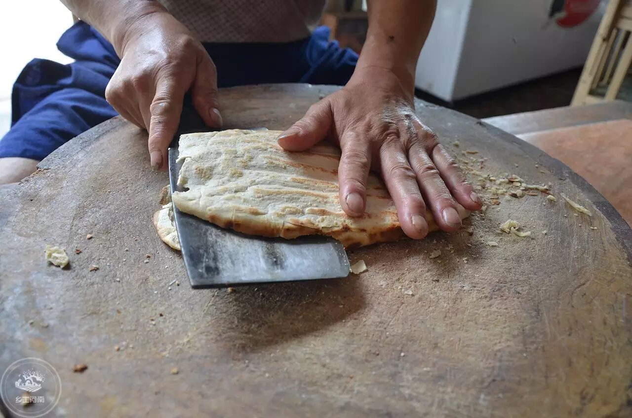 热锅盔下不了刀,稍稍放凉之后,一刀片开,切成细丝,这一张锅盔正好可以做一碗烩馍。