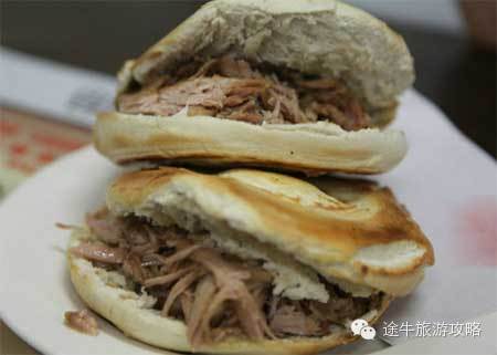 去西安不吃肉夹馍,绝对算是白去了。腊汁肉夹馍,在烤的脆脆的馍里面夹入羊肉和菜,分量很大,极力推荐品尝。