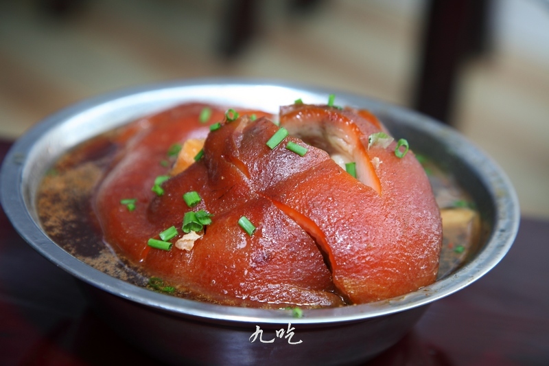 自贡牛佛古镇的烘肘,烘肘最好吃的不是里面的瘦肉,是皮和肥肉,那口感火巴而不软,略带弹性。吃时,用刀把肘子切成小方格,一口一坨,很是过瘾。