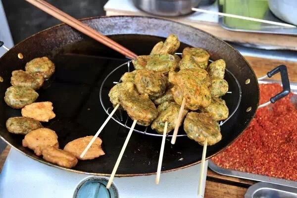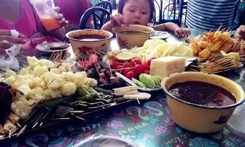 不是江油人肯定不懂沾沾是什么新奇的事物。其实说穿了有点像成都的钵钵鸡,但又有很大的不同之处。沾沾是由一根根牙签穿上各种各样的食物(比如有:土豆,藕,豆腐,凤尾,笋子......)都切成小样.在穿之前都已经用白水煮熟.然后配有红白味的沾味料。