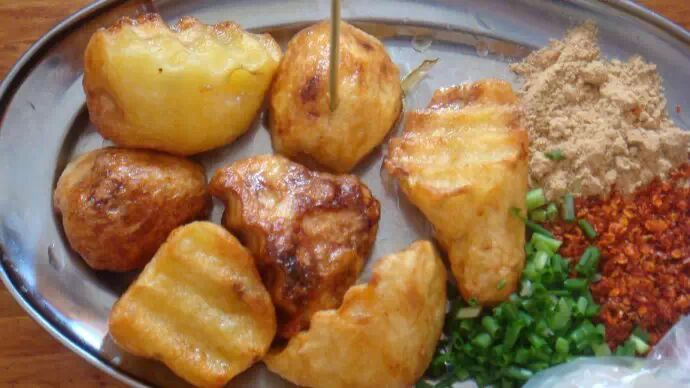 西昌的夺命洋芋。简陋的洋芋小摊到处都是。,头的皮炸脆了,里头的口感却像土豆泥,而且甜得过心。炸洋芋夹酸菜,大个土豆起锅后,蘸海椒面,再从中间剖成两半,里面夹酸菜。