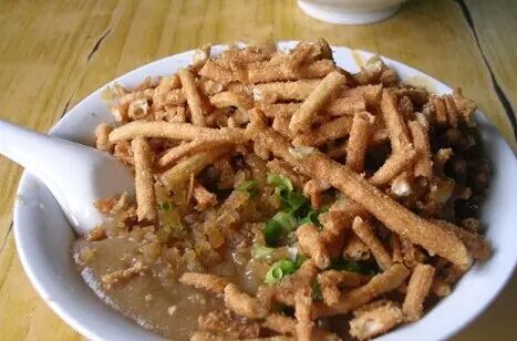 橙黄色的糊状油茶搭配精致的调料,被掐碎的馓子堆在油茶上,再用细瓷调羹入碗搅拌,就成了一碗油茶。和北方的油茶不一样,四川的麻麻辣辣的,上面的馓子脆脆的特别好吃。四川阆中、西昌等地都有油茶。