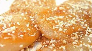 巴中恩阳镇的提糖麻饼形状不同于普通麻饼,它的中间往两面隆起,形成类似于飞碟的样子;而且其内面均匀地抹有一层薄薄的融化的红糖,单独吃起来香脆微甜;地道的吃法是从侧面咬开一个小口,再夹上凉菜凉面一起吃。