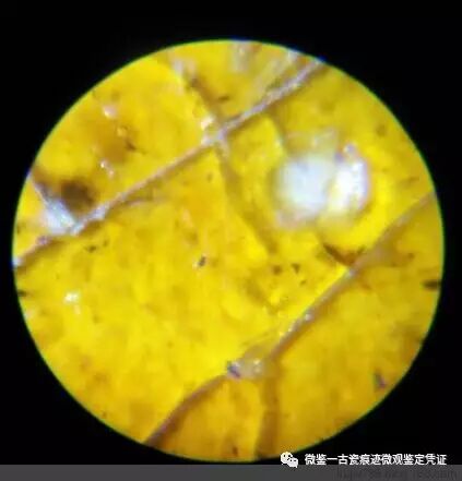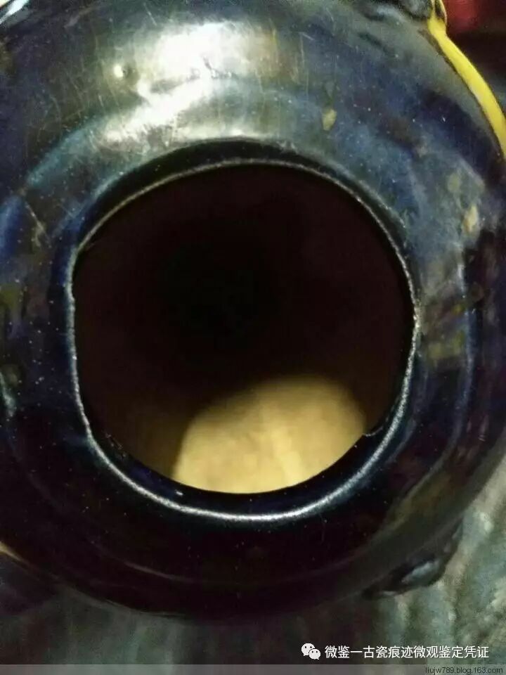 这件唐三彩雕刻牛头人物葫芦瓶微观放大100倍,黄釉上看到翘皮纹自然压力开片凸出次生物,黄釉上腐蚀变白的气泡时间老化的唐代证据。褐、黑等色的杂质带入釉里,符合唐三彩的微观图,确定唐三彩瓷器。