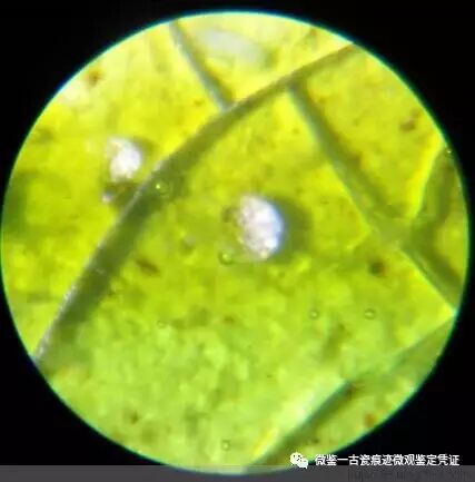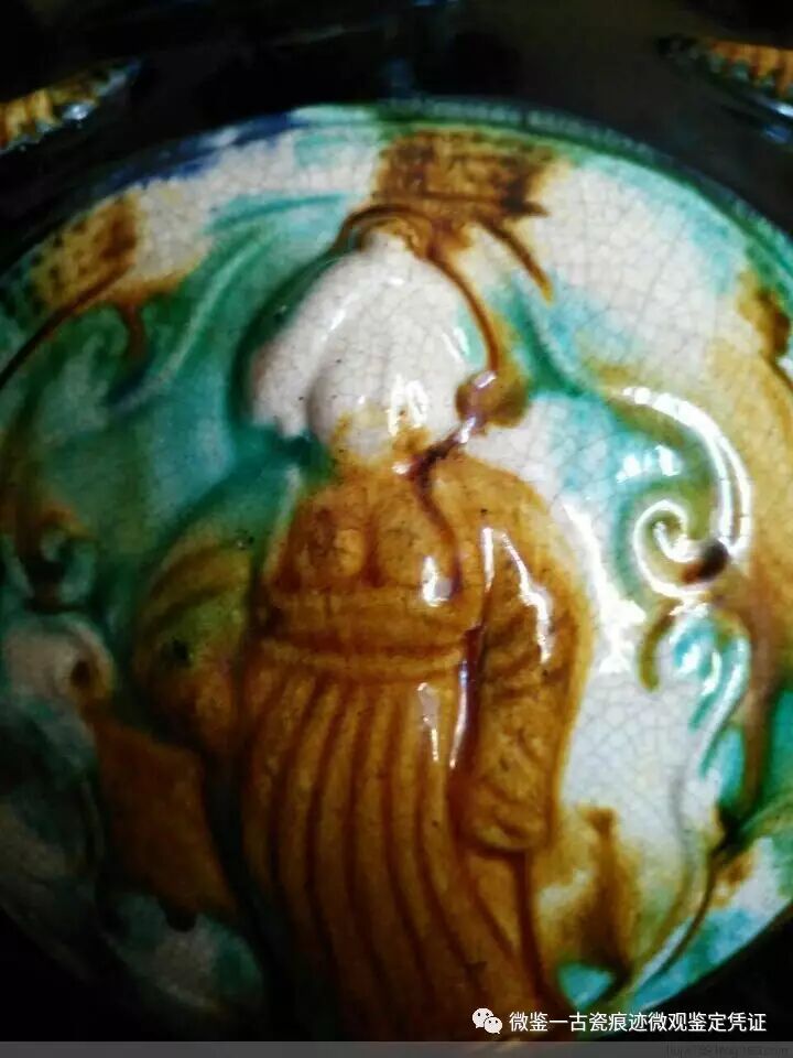 这件唐三彩雕刻牛头人物葫芦瓶微观放大100倍,绿釉上看到翘皮纹是自然压力凸出次生物,绿釉上腐蚀变白的气泡时间老化的唐代证据。褐、黑等色的杂质带入釉里,符合唐三彩的微观图,确定唐三彩瓷器。