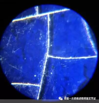 这件唐三彩蓝釉开光三彩人物贴牛头葫芦瓶蓝釉微观放大100倍,以天然钴石矿为着色剂,为低锰低铁含铜钴料没有气泡腐蚀现象,但蓝釉上开片腐蚀变成白颜色纹,突出次生物代表时间老化的唐代证据,符合唐三彩的钴石矿微观图,确定唐三彩西亚地区进口的钴料特征瓷器标本。
