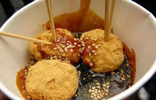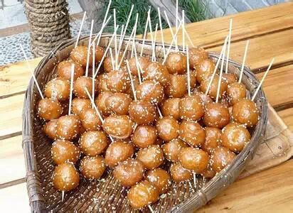 糖油果子又称天鹅蛋。因形似而得名。青石桥三绝之一。特色泽黄亮,外酥内糯,香甜可口。糖油果子以糯米、红糖和芝麻为原料,将糯米粉团在油中炸制后裹上白芝麻并用竹签穿起来。一串有四五颗左右。每串约2元钱。每一颗糖油果子浑圆光亮,呈棕红色,有焦糖香味,表面有喷香的白芝麻,咬下去皮脆内软,更有炸的好的果子里面是空心的。微带酸味的粘软糯米和焦脆香甜的外皮和着白芝麻嚼在嘴里,越吃越有味道。
