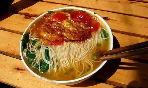 四川家常的煎蛋面做法。蛋煎得很好很香,外面煎得酥了,里面还是有点溏心的。面是细的挂面。汤底是酱油辣椒油调的,加上青菜和番茄,味道有点咸辣里透酸。