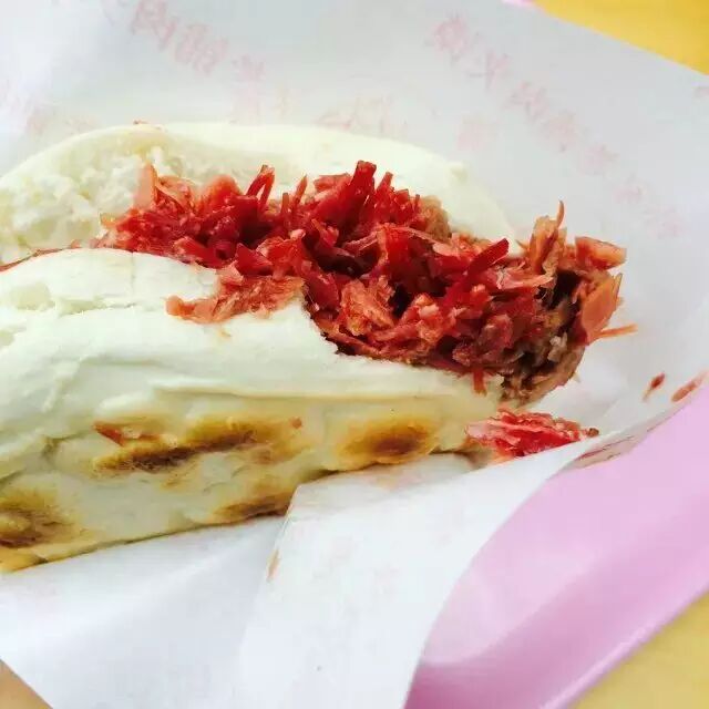 西安肉夹馍里面的肉肥瘦结合,要趁热吃,馍很酥很脆,肉是卤的。馍酥肉烂不柴不腻。![]()
