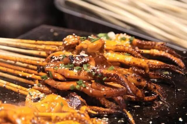 烤鱿鱼、烤海肠子、海鲜焖子、咸鱼饼子、海凉粉、油爆海螺