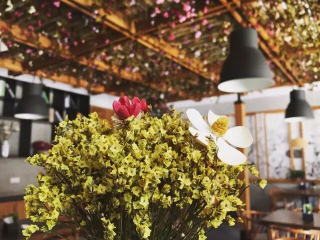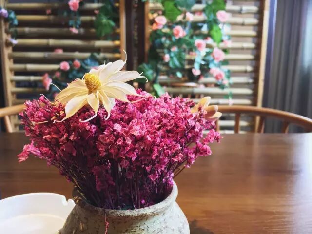 渭南老街坐落于蜿蜒如绿色玉带似的湭(沋)河之畔,仿古建筑沿岸而建,而汉中院子就位于渭南老街之中,造型逼真的花蔓缠绕堆叠在门头和店内的竹制镂空隔断上面,明清风格的花窗半掩,餐桌上、柜台上干花散发着淡淡幽香。闻着淡淡的花香, 伴着窗外沋河的微风 ,心情不由自主的荡漾起来。
