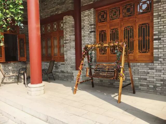 这是一家颇有情怀的院子,花窗半掩着玫红色花朵藤缠绕着小秋千......每一块木头都充满了质感......