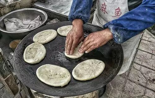 有一搭没一搭闲聊着,叔手里可是一刻都没停过!特有的香味,老往我鼻子钻,一下想起小时候,一帮小不点,围着锅盔铺子,看着师傅们手里的擀面杖,敲得邦邦响,眼睛瞪得大大滴,就等香喷喷的锅盔出炉哟!