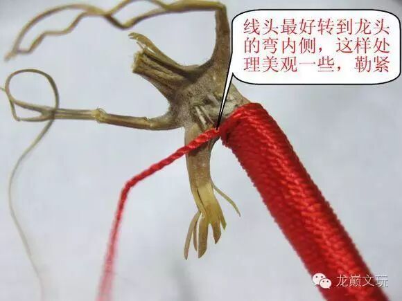 首先,你要有根红绳。不管你是正反系法,注意那截短的线头是向上的。留的长短自己看着办,以不超过龙头最上面能缠的地方为准。下边看图说话!