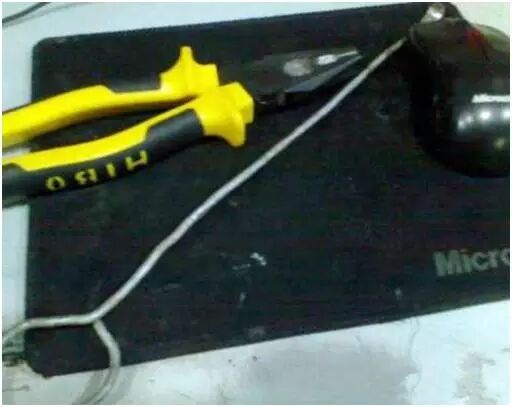 第一步,选择一根比较粗的铁丝,尾部做成一个环的形状,把前端砸平。玩友们可能都已经看出,这是个自制的工具,具体是做什么的呢?后面会为您揭晓答案。