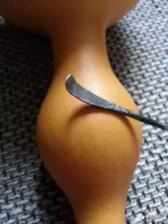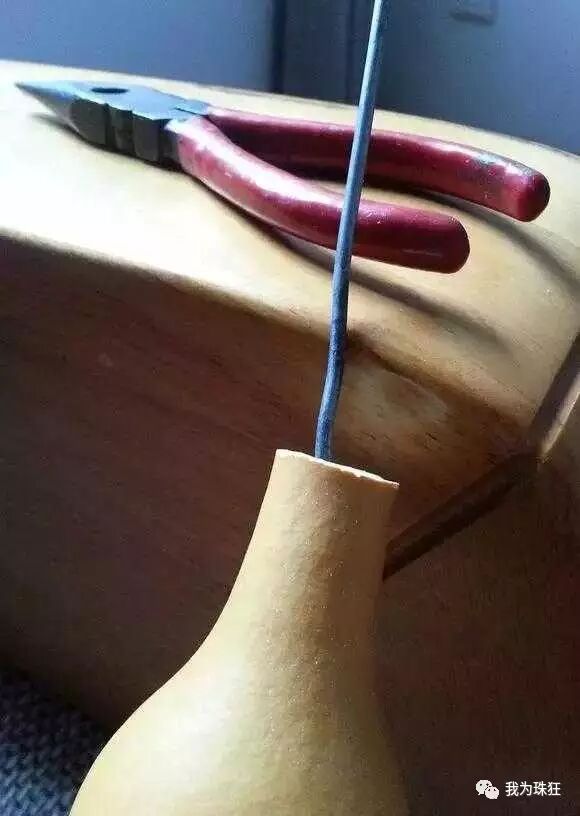 我选了一个下树五年的葫芦,喜欢这种略显夸张的形状,关键周身没有一点伤。葫芦嘴用锯锯开,嘴部留长一些,既美观也有助与镶口(短颈可以直接开口,这种长的我认为还是镶嘴后更耐用些)。将软铁丝顶端一端敲扁形似挖耳勺,另一头弯成环可以使上劲。伸进葫芦里一溜溜按顺序挖出籽和瓤,反复挖注意用力不要太大防止捣漏。