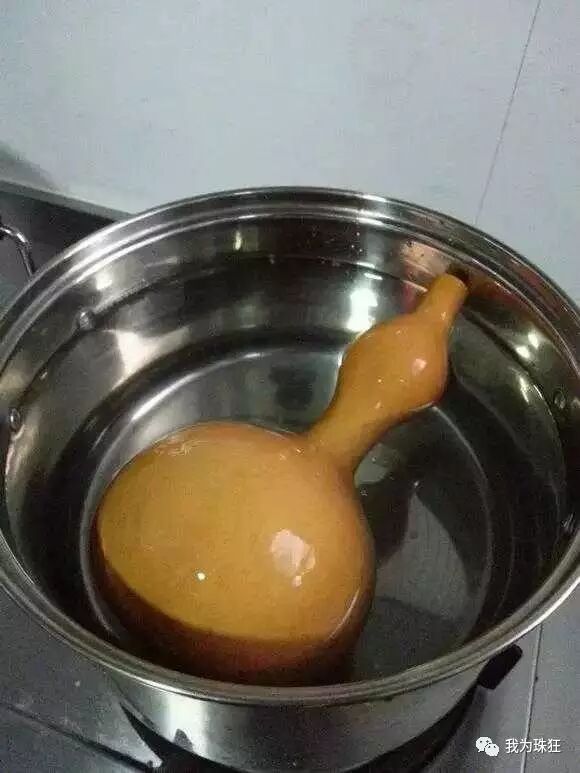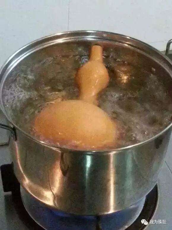 浸煮:刮完种的葫芦用清水浸泡半个钟头,视气温而定目的是要泡透,然后用沸水煮十多分钟然后关火加盖自然冷却期间需要翻动避免阴阳色,煮葫芦时会掉色这样会使颜色会深这给葫芦加重一层自然色,全程不能沾油。葫芦捞出用铁丝继续挖出煮回软的瓤后反复内外冲洗。