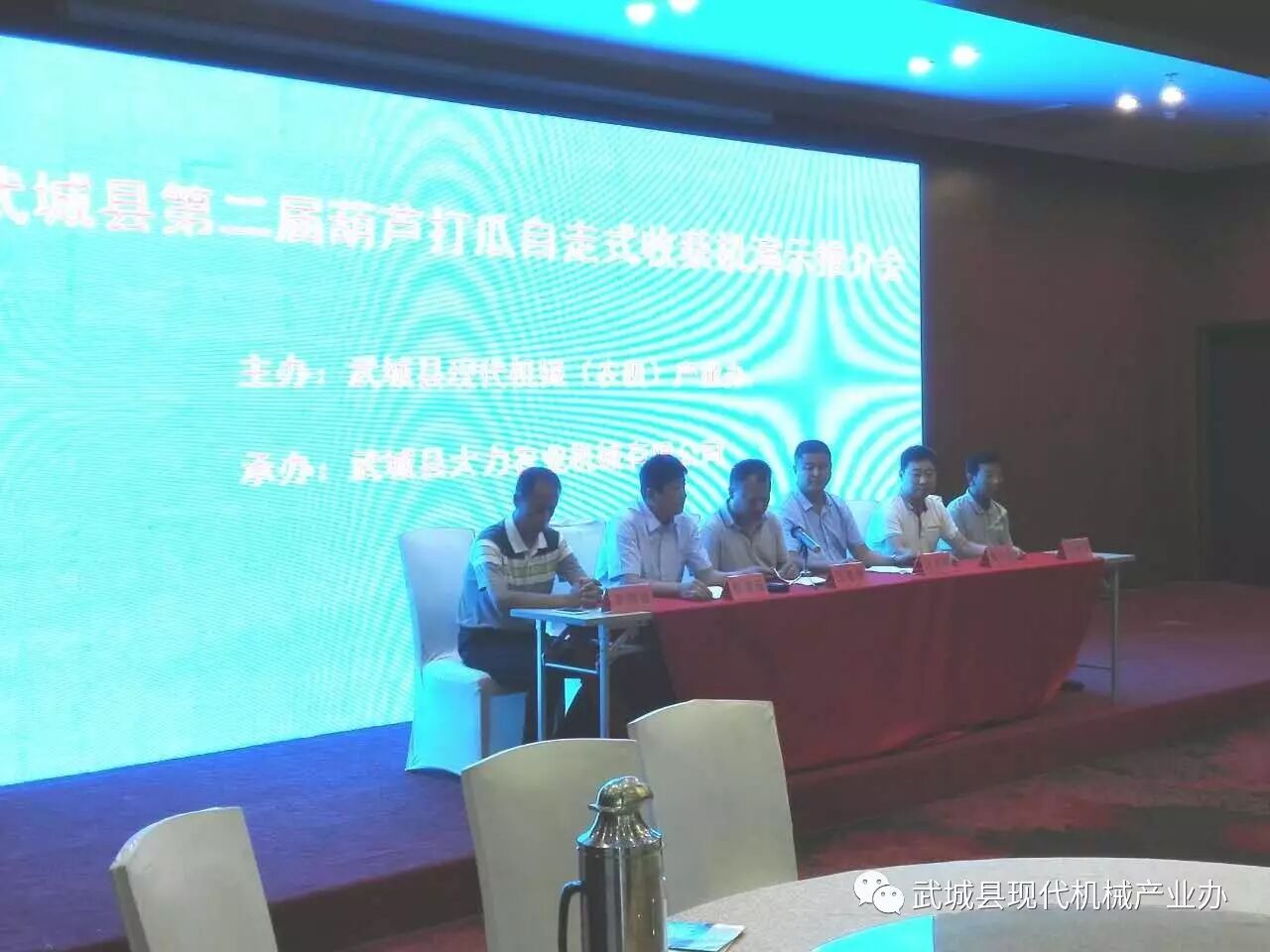 7月17日-18日,由武城县现代机械(农业机械)产业办主办、武城县大力农业机械有限公司承办的武城县第二届葫芦打瓜自走式收获机演示推介会在我县成功举办。来自内蒙古、新疆等地的农机手、经销商和农机大户代表200余人出席了本次推介会,并赴试验田现场观看了武城县大力农机公司新型葫芦打瓜自走式收获机的现场作业演示。武城县农机局局长、现代机械产业办主任王建峰出席了开幕式并发表了热情洋溢的致辞,武城县农机局党组副书记、现代机械产业办副主任高洪岗,武城县农机局办公室主任李顺强参会。