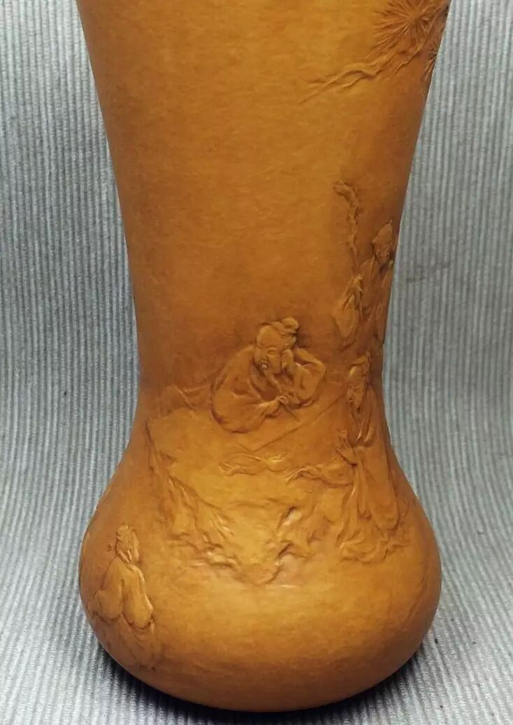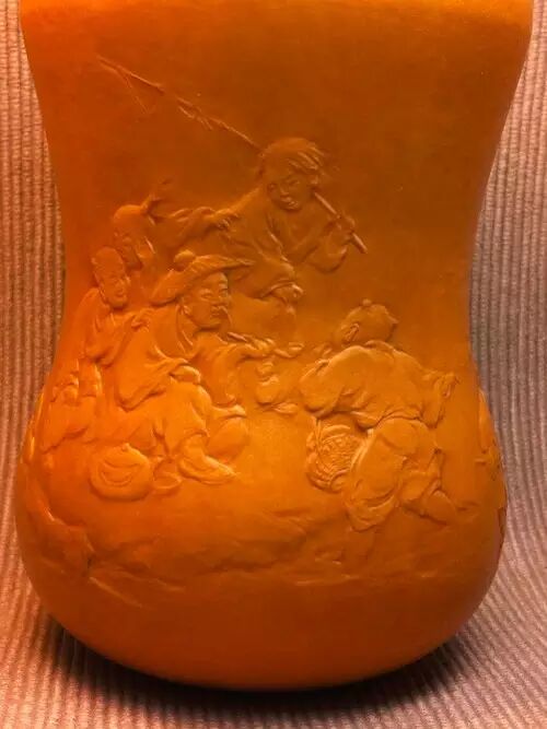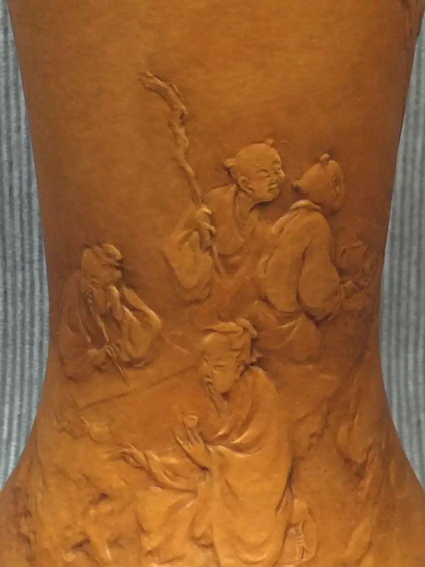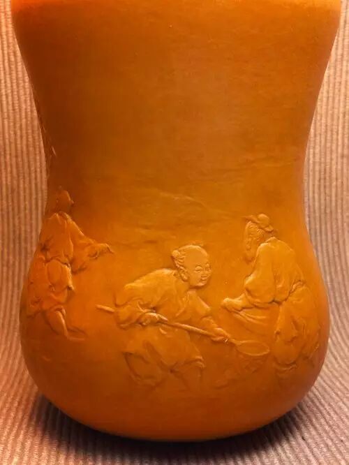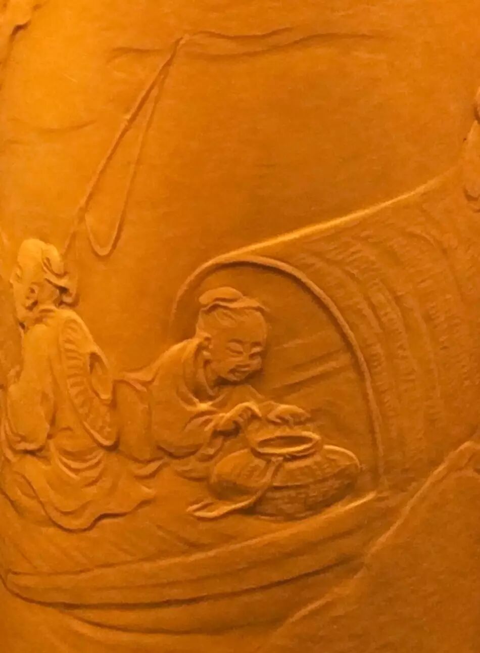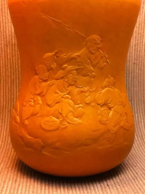 在唐太宗年间,长安城外泾河沿岸,有两个贤人,一位渔翁,一位樵子。二人于回家途中,上演了一段渔樵对答,争个山好水好。此作品为葫芦外壁竹胆茶叶罐。构图简洁,神态生动,尤其是柳树巧妙表现的技法,在葫芦押花中首次运用,属技法上的突破。