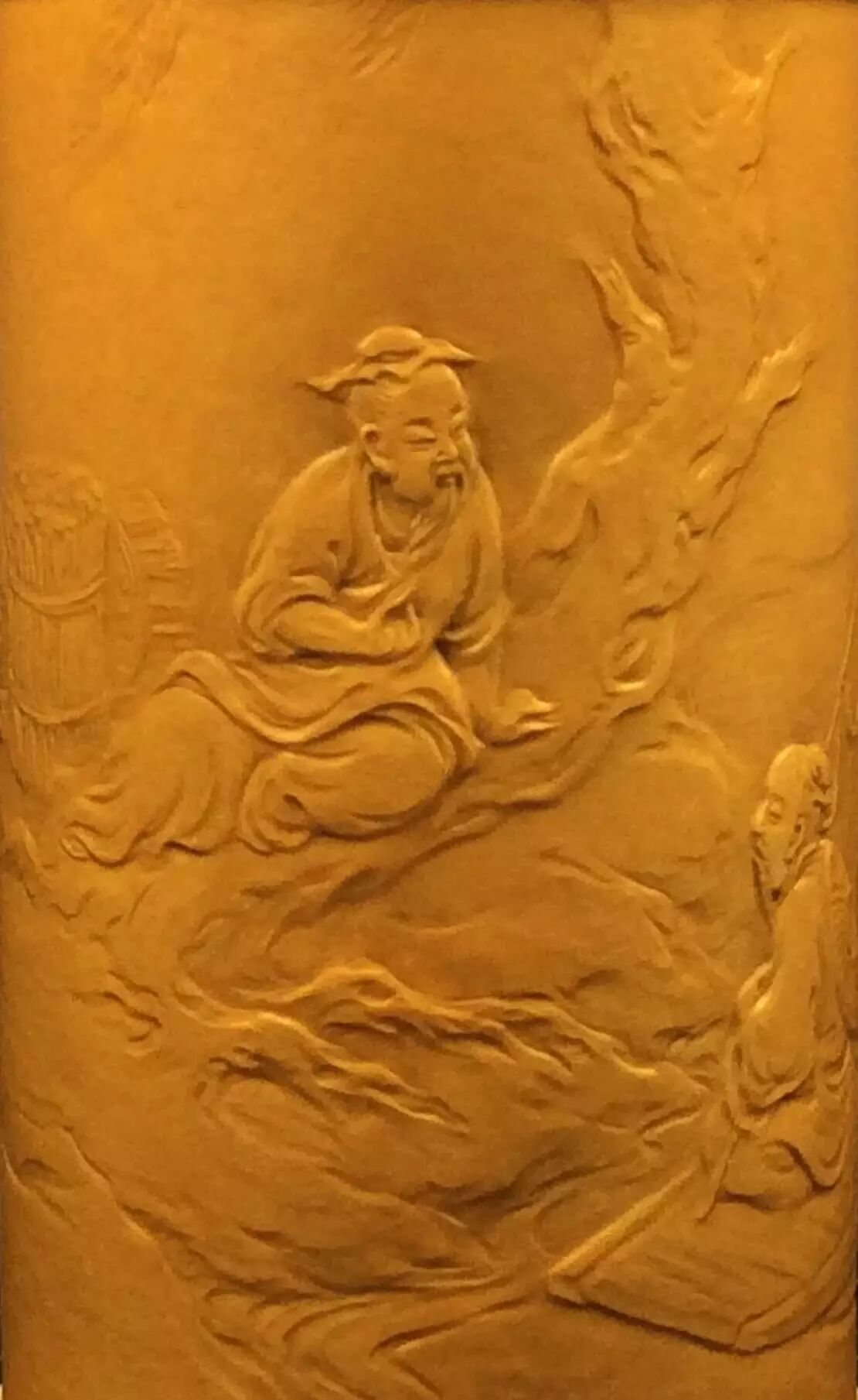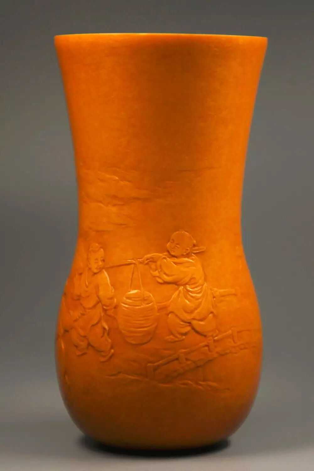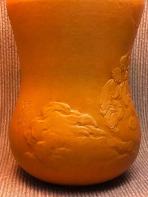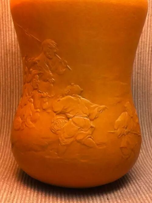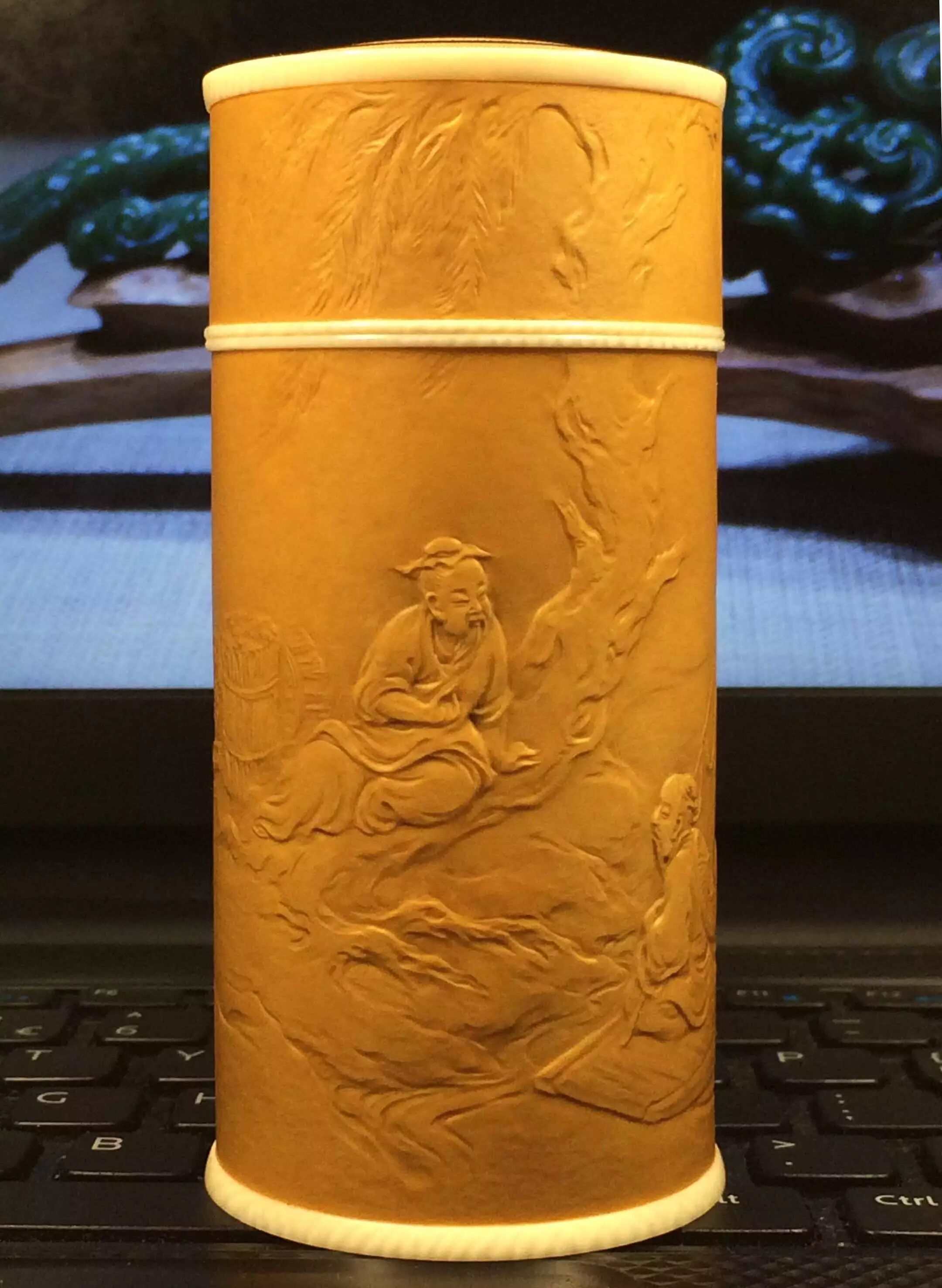 在唐太宗年间,长安城外泾河沿岸,有两个贤人,一位渔翁,一位樵子。二人于回家途中,上演了一段渔樵对答,争个山好水好。此作品为葫芦外壁竹胆茶叶罐。构图简洁,神态生动,尤其是柳树巧妙表现的技法,在葫芦押花中首次运用,属技法上的突破。