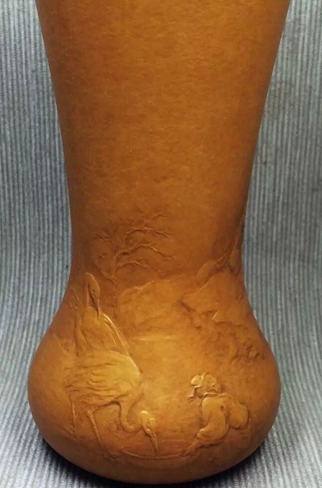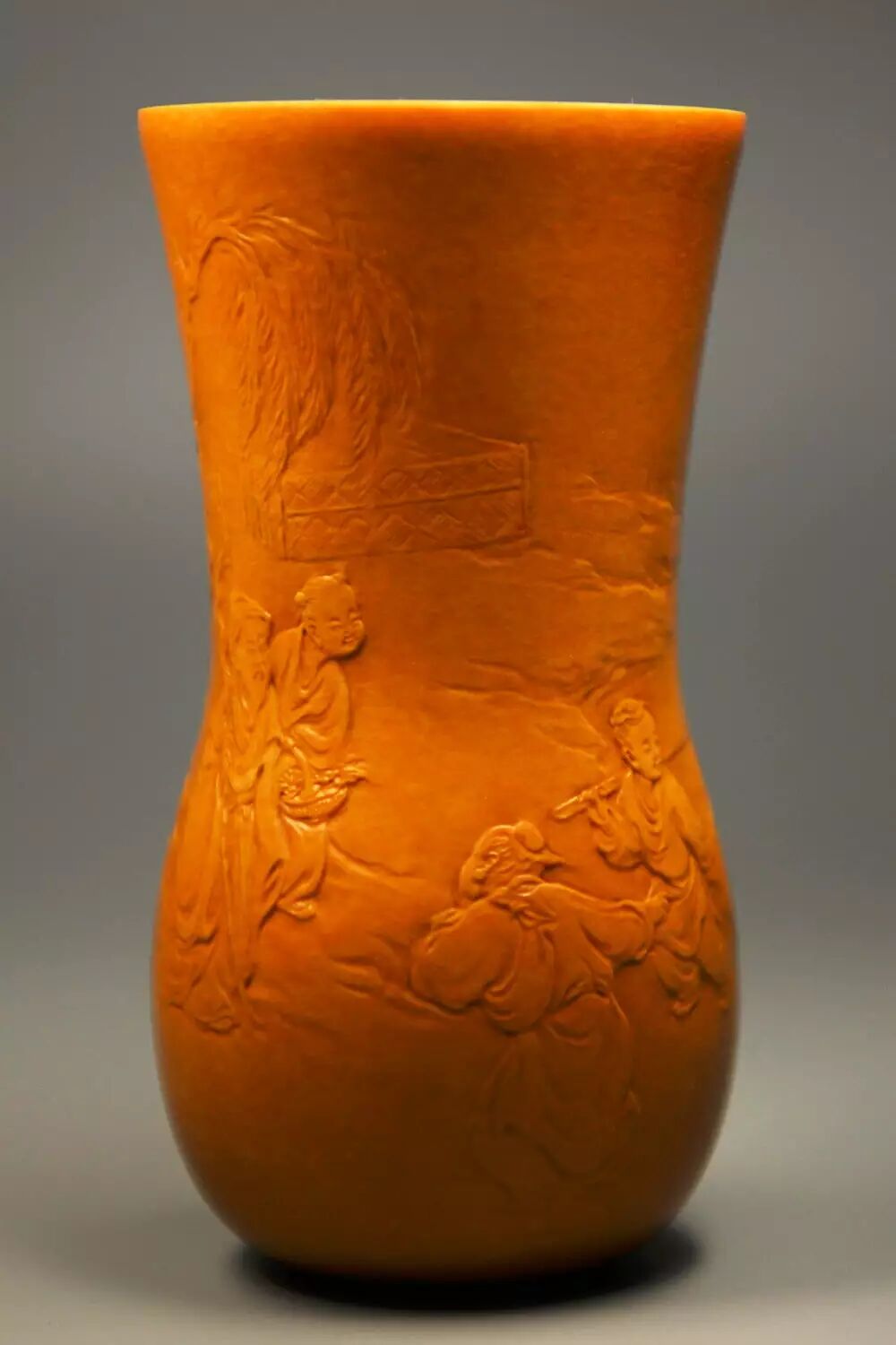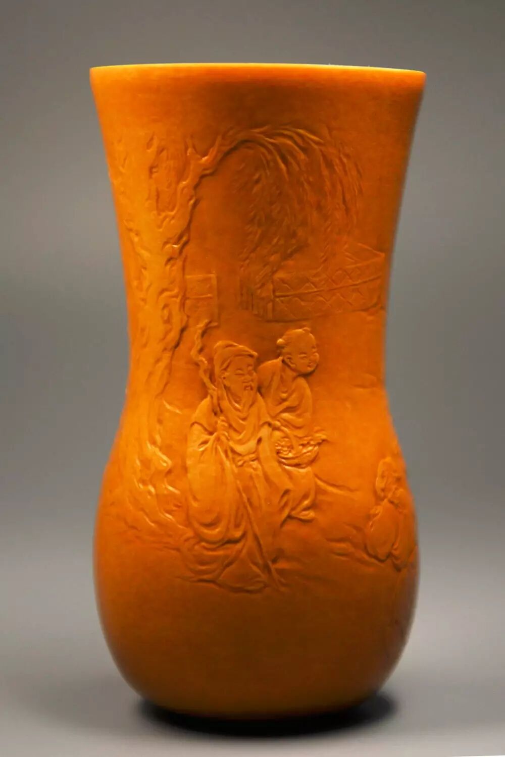 高身葫芦,意境高古。画面中间两位文人悠闲喝茶赏鹤,前方一童子蹲坐于地上,一边回首张望,一边手持食盆喂养仙鹤。老者身后两孩童,一位准备茶具,一位执掌目视前方,整个画面飘逸洒脱与身旁怪石、苍松相互依托。