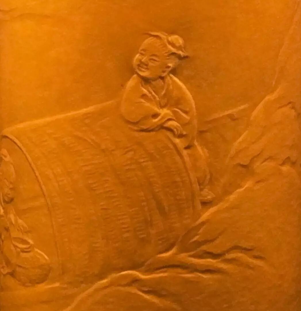 晋•王弘遣白衣使送酒酌陶潜的故事。 身穿白衣的人前来送酒。后泛指送酒的人。也比喻自己所渴望的东西朋友正好送来,遂心所愿。陶渊明身着文人装,手执长杖,身后采花童子手提盛满菊花的藤篮。对面桥头儿一白衣家人手指酒坛,两名童子抬着一坛美酒从桥上下来。此情此景与远处的柳树、篱笆、水岸,遥相呼应,形成天人合一。