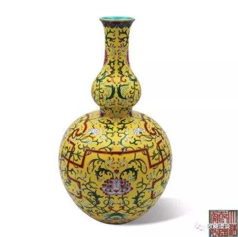 此黄地粉彩描金福寿纹葫芦瓶,撇口,长颈,上腹下垂,下腹扁圆,圈足。口沿绘金彩,下绘如意云头边饰,器外壁黄地粉彩绘勾莲纹,枝叶繁茂,凸显植物的茁壮和生命力。上腹部绘有对称“团寿纹”,下腹红彩饰“卍”字符,四端纵横伸延,互相衔接,也称万字锦、万字不到头纹。寓意绵长不断和万福万寿不断头之意。足圈饰莲瓣纹一周。底施松石绿釉,矾红彩书“大清乾隆年制”六字篆书款。此器造型端庄秀美,纹饰繁缛,制作精美绝伦,纯净莹润的黄釉色地与色彩华美的粉彩纹饰相配,为乾隆粉彩器的上乘之作。