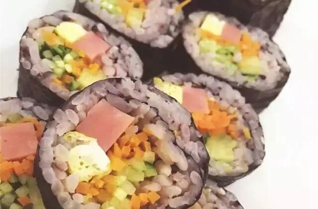 一客有9件,里面的材料很多:火腿、青瓜、胡萝卜等配料,味道清爽!饭好软有入口,口感很棒!