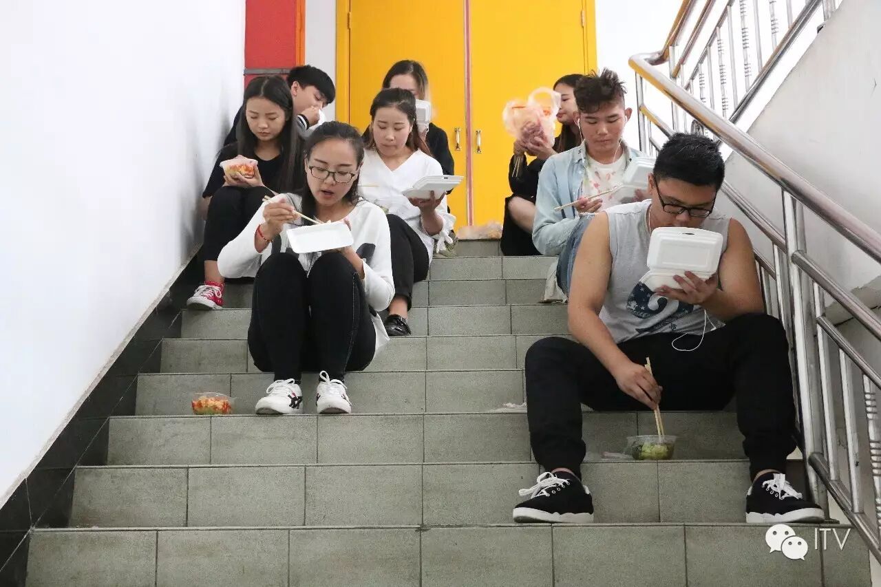 席地而坐,吃起了简便的工作餐 即使是上台前几分钟,老师还是不忘叮嘱大家注意事项