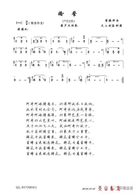 《婚誓》是电影《芦笙恋歌》里的插曲,旋律轻灵优美,婉转缠绵,加上电影中贯穿男女主角的爱情,一经播出,立即传唱大江南北,广受大家喜爱。这部1957年上映的黑白老电影可能很多人没看过,可这首插曲一定有很多人听过,甚至会哼唱,由葫芦丝来演绎这首脍炙人口的歌曲,更是别有一番风味,如今它已成为一首葫芦丝入门的必学单曲。