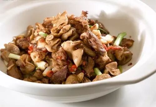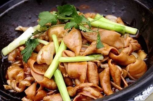 拆骨肉(白煮猪头肉上拆下的肉)、猪大肠各200克,泰椒15克,葱节5克。