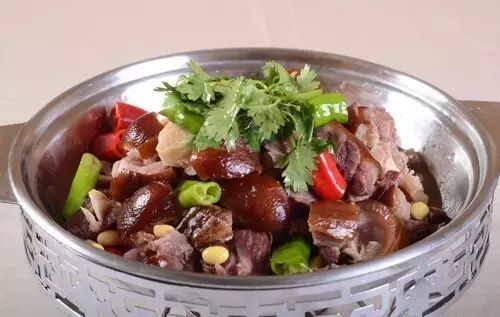 2、锅入菜子油烧至七成热,下入姜片、花椒粒爆锅,然后下黄豆、猪手块、花雕酒小火煸炒出香,接着加入清汤、盐、鸡粉调味后,小火煨30分钟至猪手软烂后,再放入蒜瓣小火煨5分钟,下入青红椒片小火煨1分钟,取出盛入盛器中,最后撒上胡椒粉、葱花、干红辣椒,带上酒精炉上桌即可。